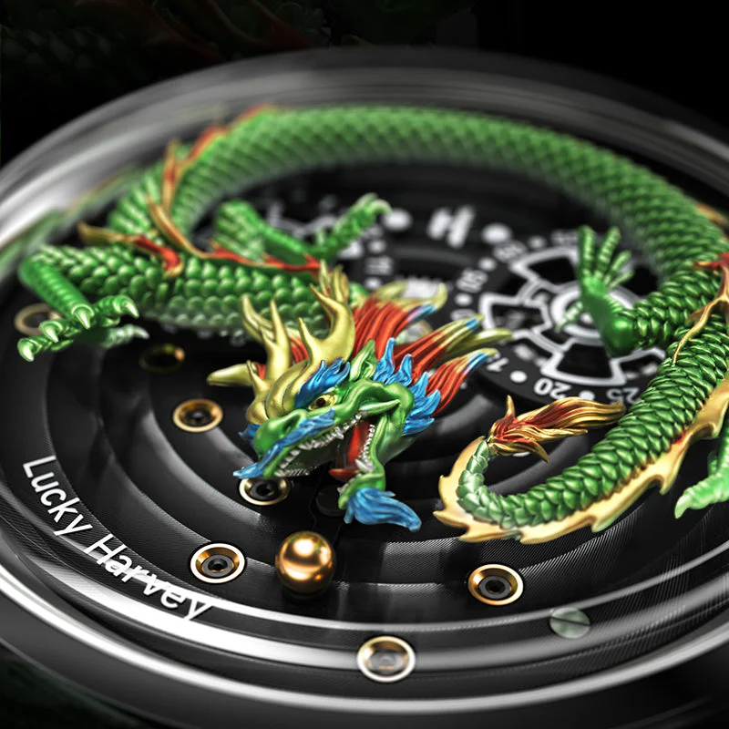The dragon, a symbol of supreme authority and good fortune, has long been revered as a powerful and auspicious figure. Drawing on this ancient symbolism, Lucky Harvey has created a timepiece that seamlessly blends tradition and innovation. This exceptional watch features a finely carved dragon in 925 silver, hand-engraved and hand-painted, encircling the dial. Its intricate design is brought to life with stunning coloration and craftsmanship.
