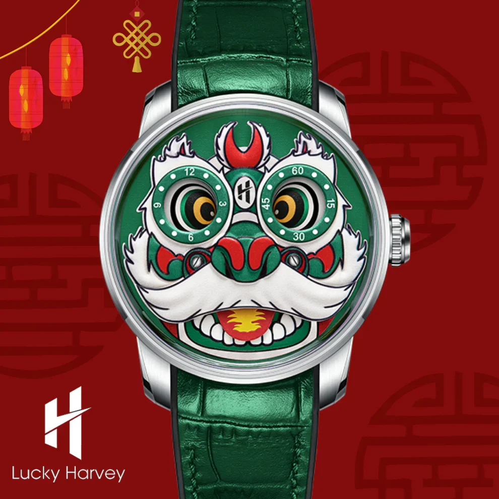 At the heart of this timepiece is an automatic movement, enhanced by an intricately polished rotor designed to resemble the classic lion dance movement. This innovative feature seamlessly combines tradition with modern horology, symbolizing confidence and cultural depth. The dial's left eye displays the hour, while the right eye marks the minutes, creating a captivating and functional design. This watch is a perfect representation of elegance and craftsmanship.